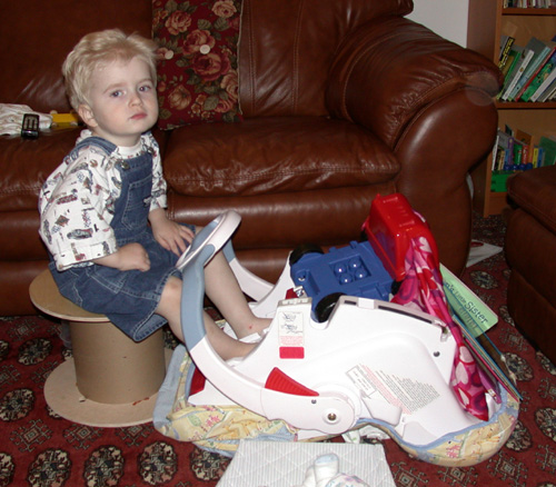 in the house. Annabelle's car seat turned upside down and a big spool made