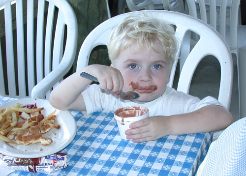 Chicken Fingers, French Fries, and Chocolate Ice Cream.