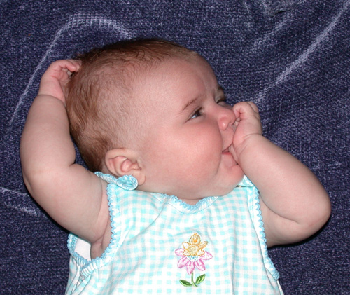 her head and chew on her hands, especially her thumb. |