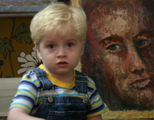 Here's Felix posing with a painting at Joanie's parents
